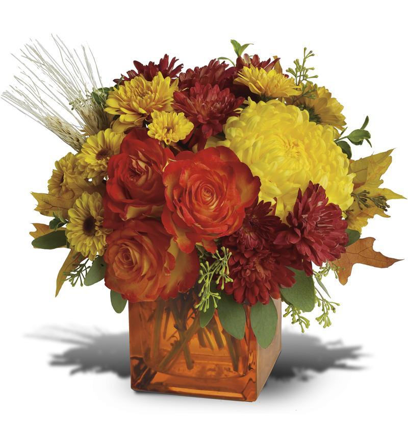 Bring a bright contemporary touch to this glorious season with a chic fall bouquet in a stylish orange cube vase. Subtly sensational, it’s a great gift for faraway friends. The stylish contemporary arrangement includes yellow cushion spray chrysanthemums, bi-color orange roses, rust cushion spray chrysanthemums, yellow disbud chrysanthemum and yellow Viking spray chrysanthemums accented with assorted greenery. Delivered in a Approx. Size: 13″ W x 11 1/2″ H