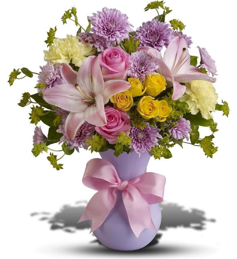 “Graceful and gorgeous” describes this stunning array of pastel flowers in a charming lavender vase tied with a pink satin ribbon. It’s almost too pretty for words. But you’ll hear many words of praise for sending it. The elegant bouquet features pink Asiatic lilies, yellow carnations, lavender cushion spray chrysanthemums, yellow spray roses and pink roses accented with assorted greenery. Delivered in a lavender plastic vase tied with a pink satin ribbon. Approx. Size: 14 1/2″ W x 16 1/2″ H”
